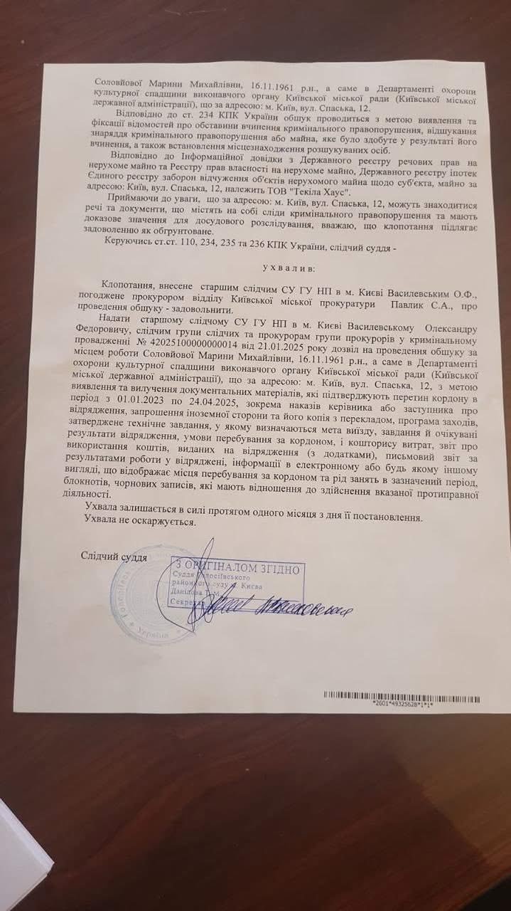 "В ході досудового розслідування встановлено, що до вчинення даного кримінального правопорушення, причетна Соловйова Марина Михайлівна, 16.11.1961 р.н., депутат КМР від депутатської фракції "Удар", обіймає посаду директора департаменту охорони культурної спадщини виконавчого органу Київської міської ради (Київської міської державної адміністрації) з 2023 р. по теперішній час три рази перетинала державний кордон України. Так, під час виїзду за кордон підстав для виїзду не було надано. Водночас встановлено, що Соловйова М. М. з 3 по 9 червня 2023 р. перебувала на території Туреччини", — процитувала Соловйова ухвалу, на підставі якої вівся обшук.