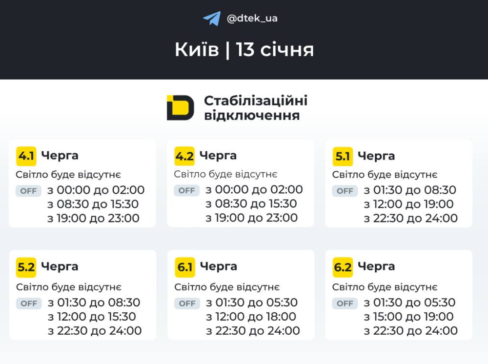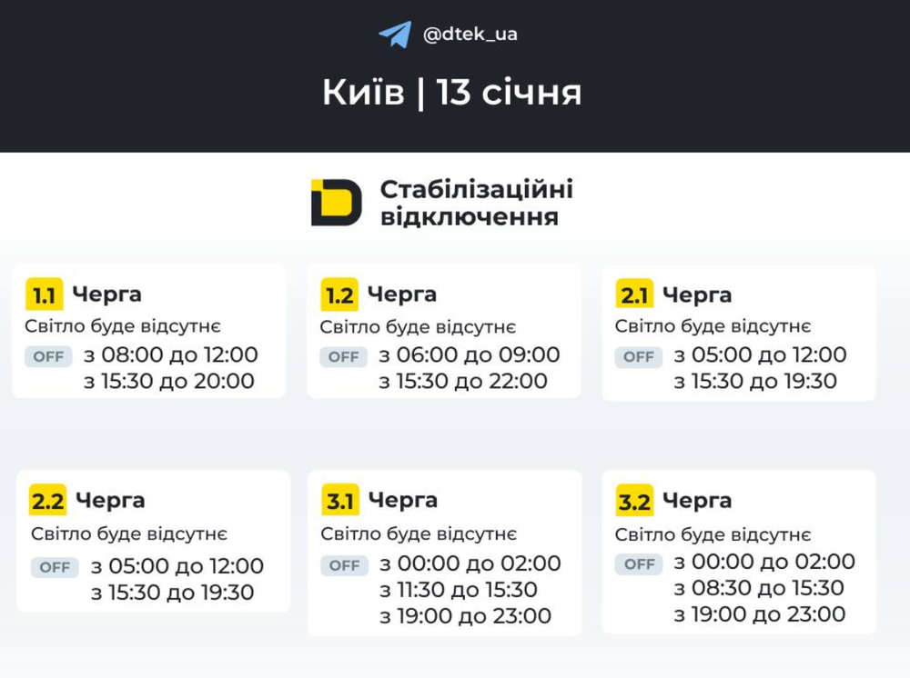 У вівторок, 13 січня, в Києві діятимуть екстрені та стабілізаційні відключення світла. Про це повідомляє ДТЕК.