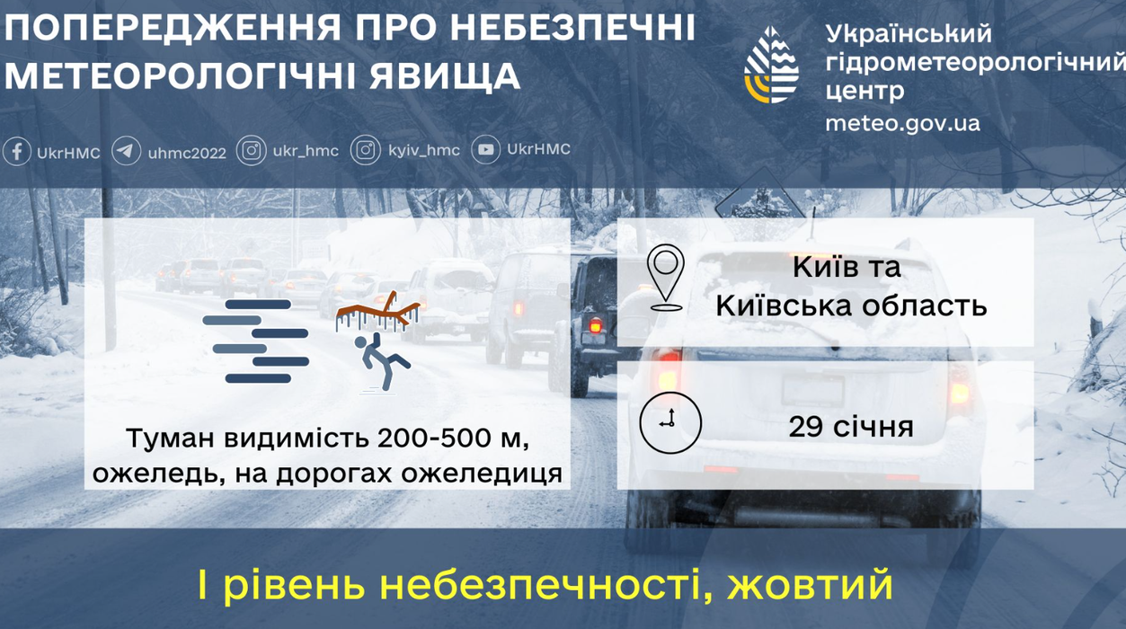 "У столиці 29 січня очікується ожеледь, на дорогах ожеледиця, вночі та вранці туман, видимість 200-500 м" — повідомляє Укргідрометцентр та КМДА
