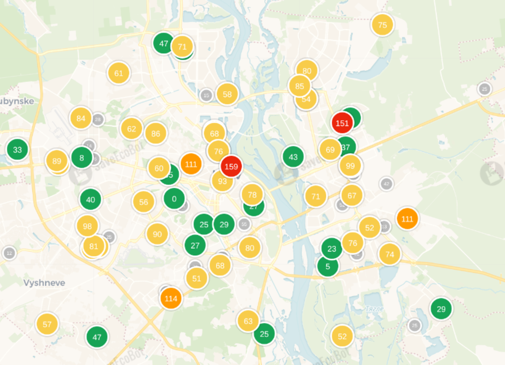 За даними сервісу моніторингу saveecobot, на Правому та Лівому берегах Києва середні показники забруднення. Такий стан повітря не є небезпечним, проте може спричинити погіршення самопочуття у людей, які мають хронічні захворювання.