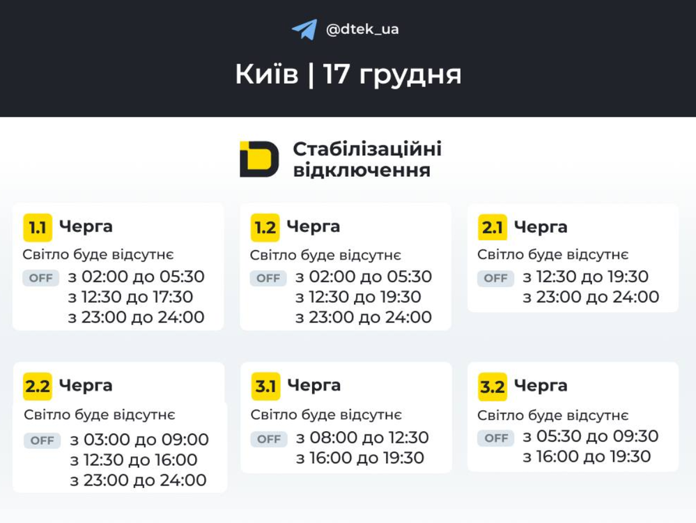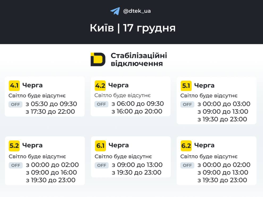 Завтра, 17 грудня, в Києві діятимуть погодинні відключення світла. Про це повідомляє прес-служба ДТЕК.