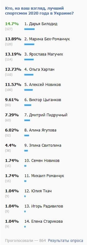 С 26-го декабря по 14-е января все зарегистрированные читатели Sport.ua имели возможность проголосовать за лучшего, по их мнению, спортсмена или спортсменку 2020-го года. Всего в опросе приняли участие 864 зарегистрированных пользователя портала.