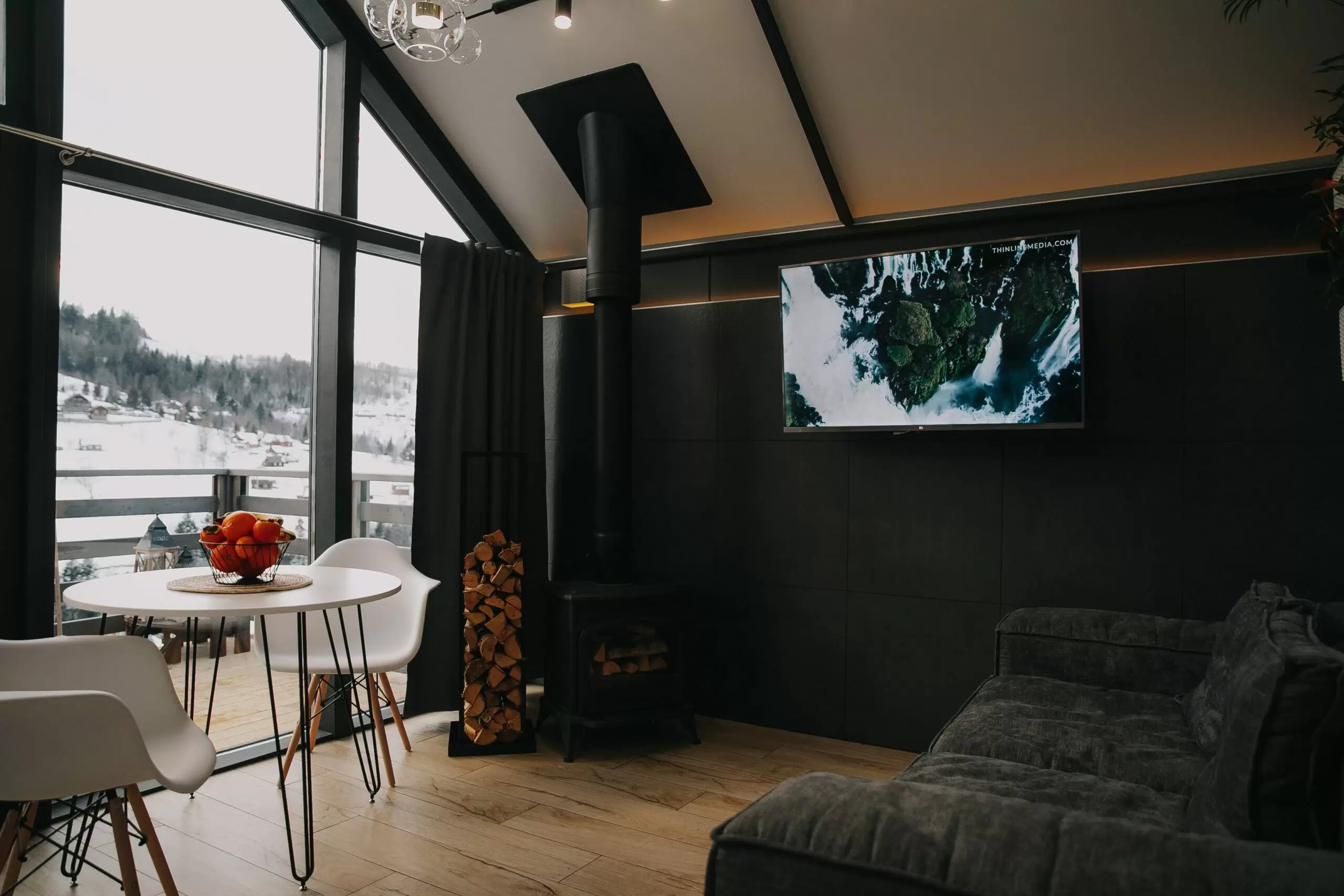 Апарт-готель “Вершина” продуманий до дрібниць. Усередині котеджу — стильний інтер’єр із натурального дерева, камін, зручні меблі, кухня з усім необхідним, Wi-Fi і сучасна техніка. Тут є все, щоб ви почувалися як удома, але з відчуттям свята.